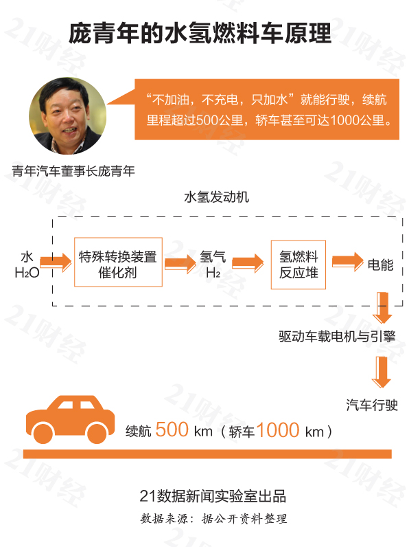 以青年汽车的说法,“不充电、不加油、只加水”就能让汽车跑起来,续航里程超过500公里,轿车可达1000公里。