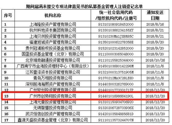 5月24日,中基协发布了《关于注销20家异常经营私募基金管理人登记的公告》。20家私募基金公司将按照有关规定予以注销,注销后不得重新登记。这其中就包括了创势翔。