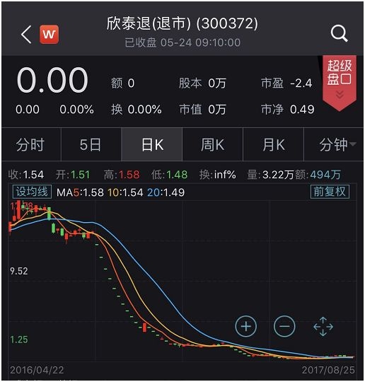 随着监管趋严,对欣泰电气采取退市处理,一点都不姑息。然后,欣泰电气走上退市之路,接连出现十几个跌停,股价从14.55元一路下行,最后以1.48元的股价退市。