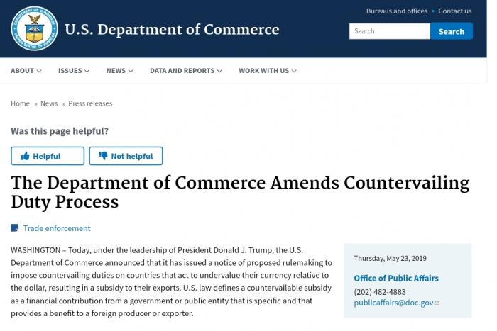 美国商务部在23日的公告中称,在特朗普的领导下,美国商务部宣布已发布制定拟议规则的通知,将对那些采取相对于美元低估其货币价值从而补贴其出口的国家征收反补贴税。由商务部国际贸易管理局内的执法和合规部门负责反补贴程序的启动和裁决。
