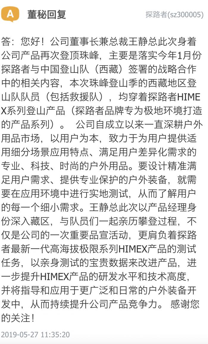 勇于攀登的同时,探路者的股价却是不进反退。股价从2015年的顶峰时的29.33元跌至目前的3.91元,跌幅近90%,市值也从260亿元,缩水至目前的34亿元。 股民和网友的评论却截然不同,认为她应该把更多心思放在公司治理上。