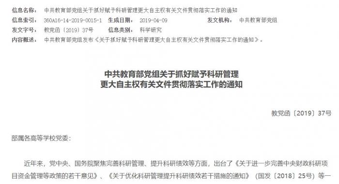 教育部网站5月27日发布了《中共教育部党组关于抓好赋予科研管理更大自主权有关文件贯彻落实工作的通知》(以下简称《通知》),从以下方面对科研管理自主权进行了规定。