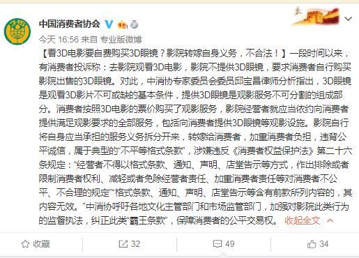 中国消费者协会官方微博5月27日下午就“看3D电影要自费购买3D眼镜”问题发声,认为该行为是影院自行将自身应当承担的服务义务拆分开来,转嫁给消费者,加重消费者负担,违背公平诚信,属于典型的“不平等格式条款”,涉嫌违反《消费者权益保护法》。