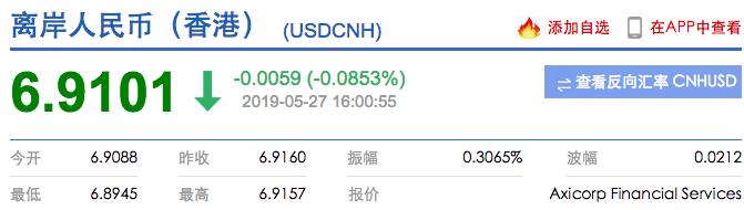 5月27日,外汇交易中心公布,银行间外汇市场人民币对美元中间价较上一交易日上调69基点,报6.8924。上一交易日中间价报6.8993,在岸人民币上一交易日收报6.9050。离岸人民币兑美元汇率盘中一度上涨近200个基点,最新报6.9101.