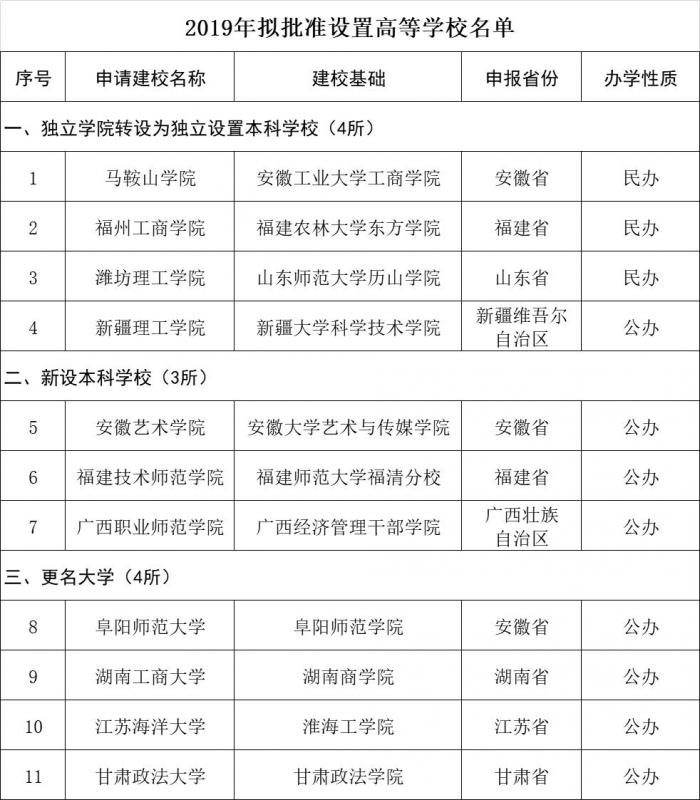 又一批新大学即将更名而至。11所由省级人民政府申报设置的高等学校获得通过,教育部网站上正在进行公示,这11所大学有的是从独立学院转设为独立设置本科学校,有的是新设本科学校,有的是更名大学。