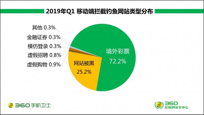 360安全大脑分析指出,移动端拦截的钓鱼网站中,有72.2%为境外彩票类网站,远高于排在第二位的网址被黑(25.2%),其余类型依次为虚假购物(0.9%)、虚假招聘(0.3%)、模仿登陆(0.3%)、金融证券(0.3%)等。