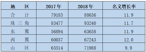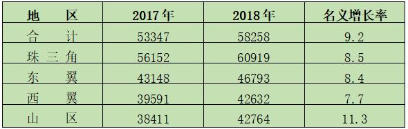 (2018年城镇私营单位分区域就业人员年平均工资。单位:元,%)