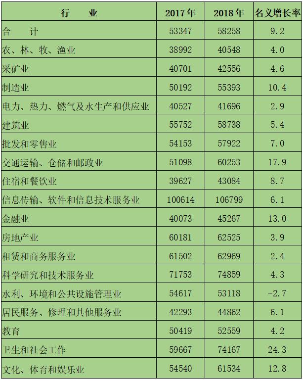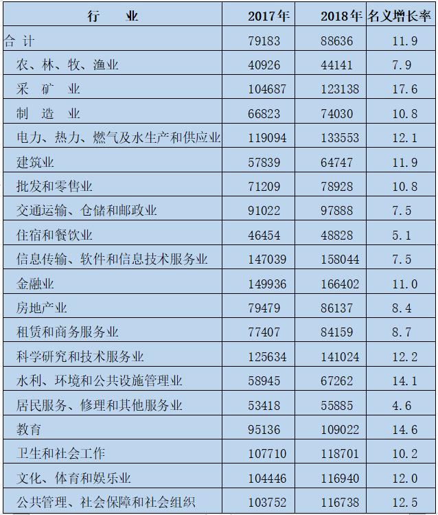 (2018年城镇非私营单位分行业就业人员年平均工资。单位:元,%)