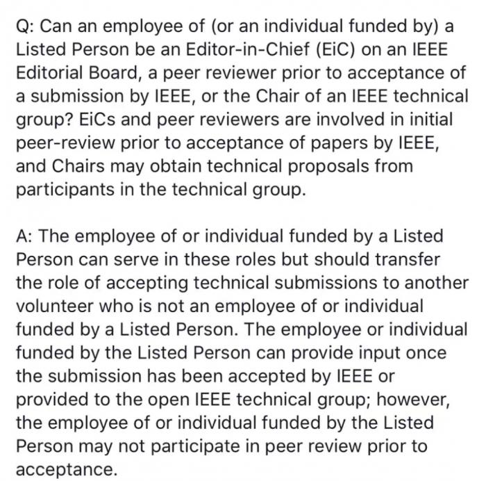 2、在华为从BIS名单中删除之前,华为的同事可以保留编辑委员会中的位置,但他们不能参与前期论文的审阅,必须要等技术论文让IEEE接受后才可以参与工作。