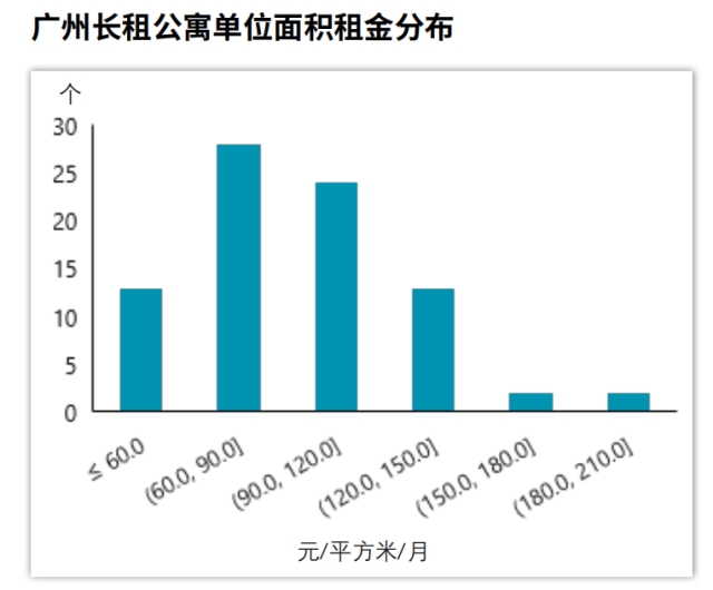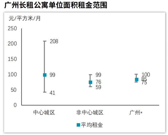 另据统计,目前广州几大集中式长租公寓的租金范围为每月41元/平方米至208元/平方米,平均租金为每月95元/平方米。这意味着按照前文平均面积29.9平方米计算,在集中式长租公寓租个一居室平均每月最低花1225.9元,最高花6219.2元,平均月租为2840.5元。