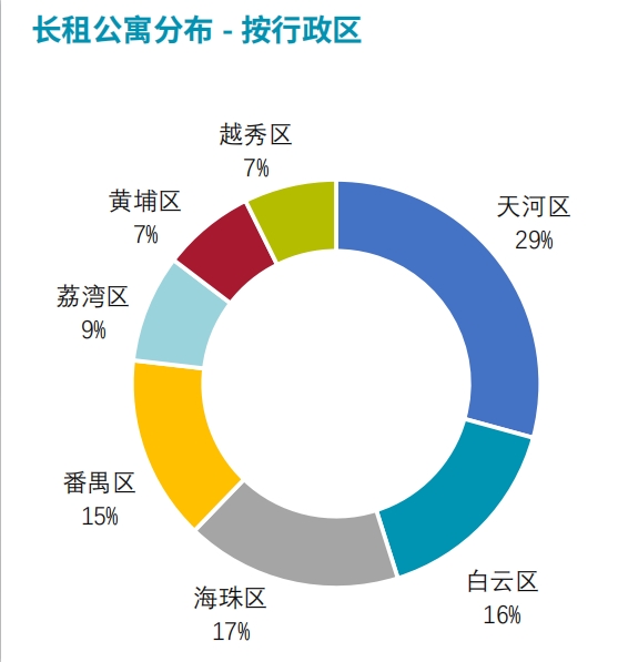 在所有城区中,天河占据大头。戴德梁行统计显示,天河共有24家集中式长租公寓,占比达到29%。究其原因,在于天河区商务人群较为集中,且集中式长租公寓多数布局在有便利交通、成熟的社区氛围和完善配套设施的中心城区地带。