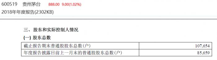 3月29日发布的贵州茅台财报显示,截至2018年末,公司股东总数为107654户,年报披露日前上一月末普通股股东总数减至85659户。