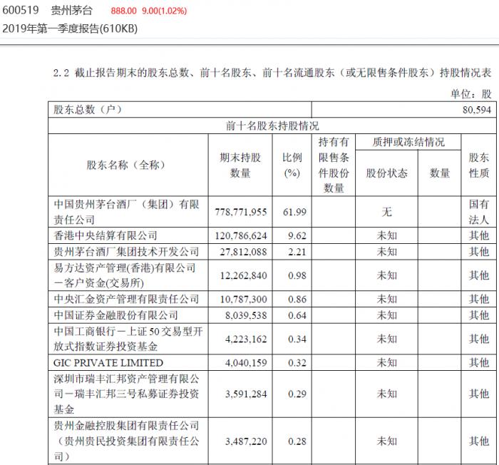 4月25日披露的贵州茅台2019年一季报显示,截至3月底,公司股东总数为80594户。对比发现,股东比2月末再度减少5065户。