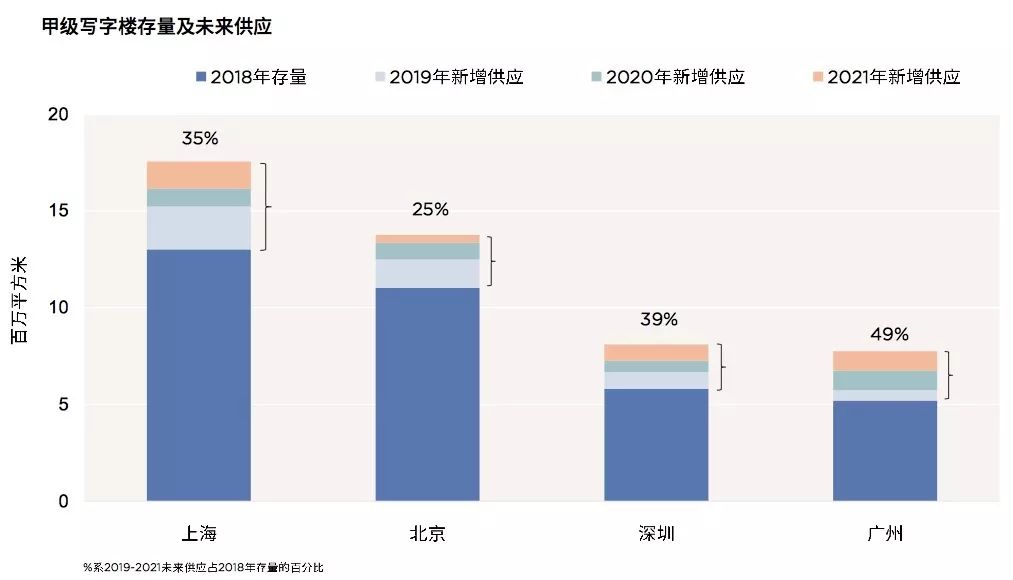 以上数据选自第一太平戴维斯发布的《2018中国写字楼报告》,上海、北京、深圳、广州是中国甲级写字楼存量最大的四个城市。