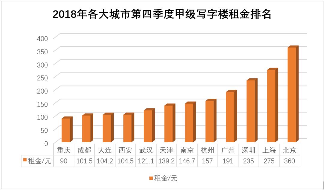 以上是第一太平戴维斯的数据,甲级写字楼最高租金毫无疑问是一线城市,其中北京以人民币每平方米每月369元的租金高踞榜首,上海则以275 元 的价格居于其后,深圳(235 元)、广州(191 元)分列三、 四位。