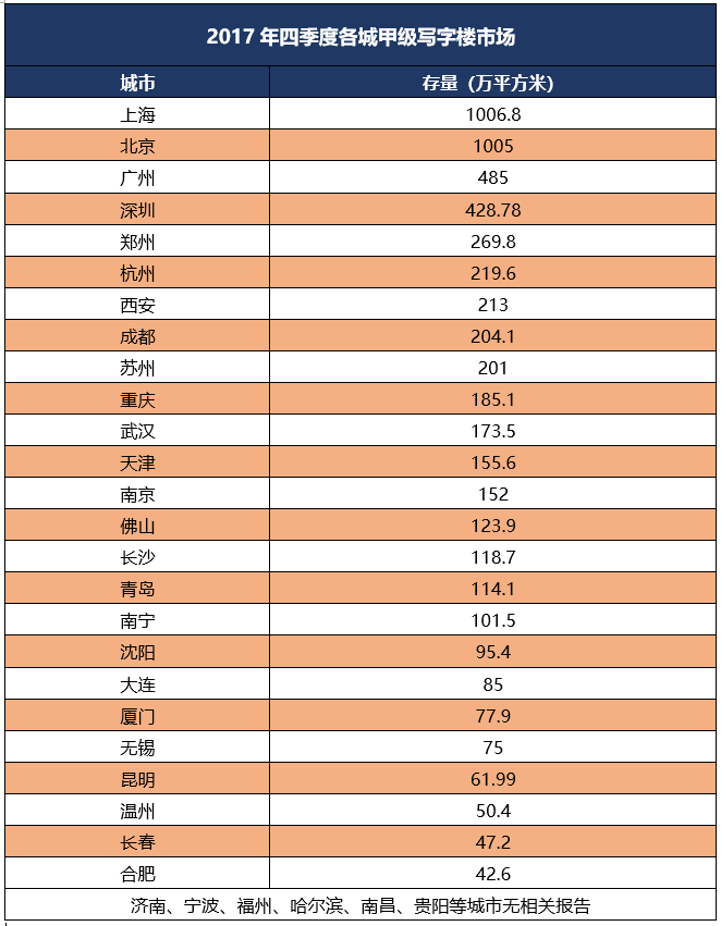 其他城市甲级写字楼存量(2018年)的数据空缺,只能提供2017年的数据做一个参考。