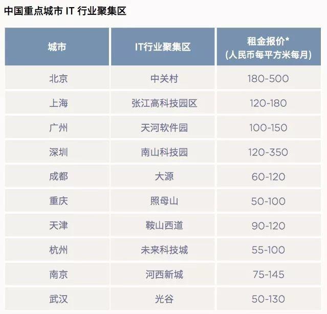 以下是各大城市IT行业聚集区的租金排名:
