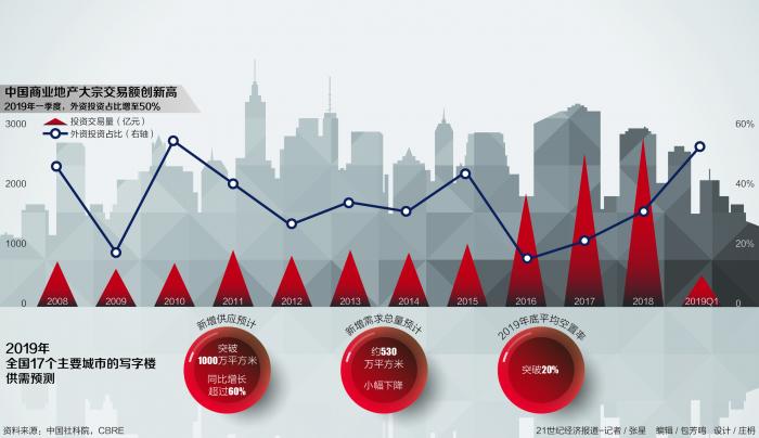 “今年投资者对国内写字楼和房产债等周期性低风险资产的偏好创下4年新高,而仓储物流、购物中心、另类资产等结构性板块亦迎来穿越周期的投资机遇。”李凌表示,在上述诸多标的物中,写字楼作为周期性类型的投资,因其易于管理、现金流稳定、交易流动性强等特点,即使在临近周期尾声、风险趋避的趋势下受到众多投资者的青睐。2019年第一季度,写字楼大宗投资交易超过250亿元,金额占商业地产投资总额的47%,较去年同期大幅提升21个百分点。