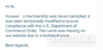 对此,SD协会在回复21世纪经济报道记者的邮件中解释道:“华为的会员资格从未被取消,我们有过短暂的升级,这是为了确保符合美国商务部的要求。华为名字在官网消失,是由于技术原因。”
