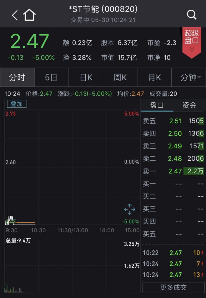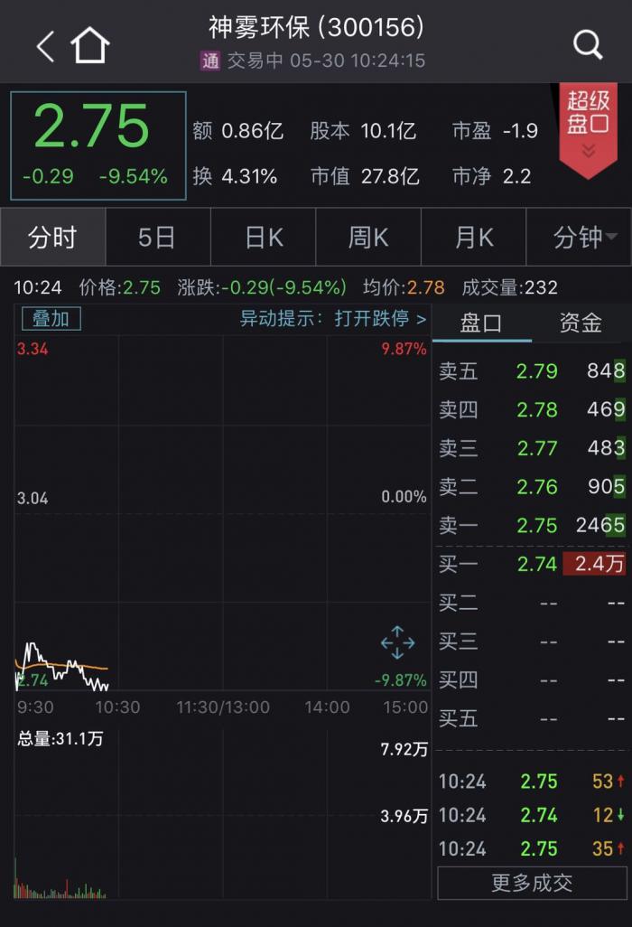 5月30日,神雾环保开盘下跌,截至记者发稿,跌幅已达9.54%;“神雾系”另一家上市公司*ST节能(000820.SZ)亦开盘下跌,目前已经跌停。