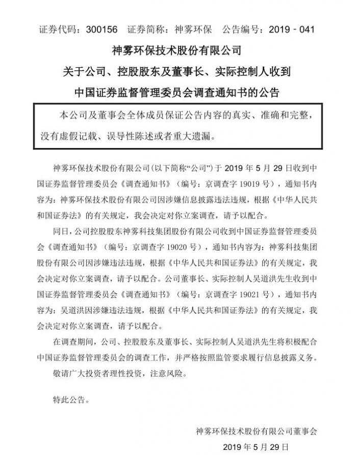 5月29日晚间,神雾环保(300156.SZ)公告称,公司收到证监会《调查通知书》,因神雾环保涉嫌信息披露违法违规,证监会决定对公司立案调查。同日,神雾环保控股股东神雾科技集团股份有限公司(以下简称“神雾集团”),神雾环保董事长、实控人吴道洪也分别收到证监会《调查通知书》,神雾集团及吴道洪因涉嫌违法违规,被证监会立案调查。