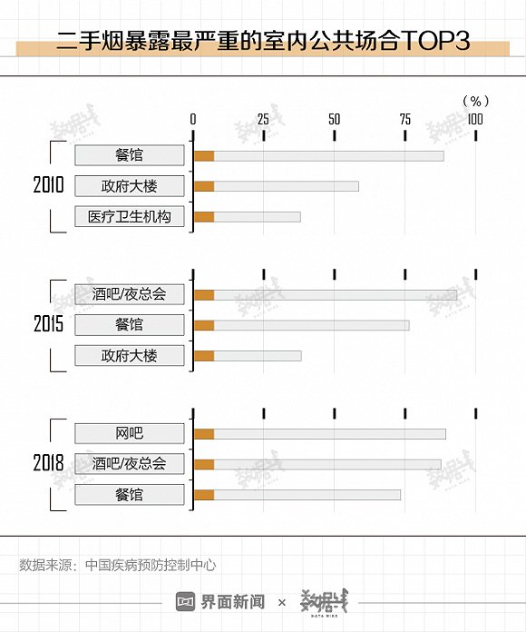 除了家里,哪最容易吸到二手烟?2010年是餐馆,2015年是酒吧/夜总会,2018年最容易吸到二手烟的公共场合是网吧。