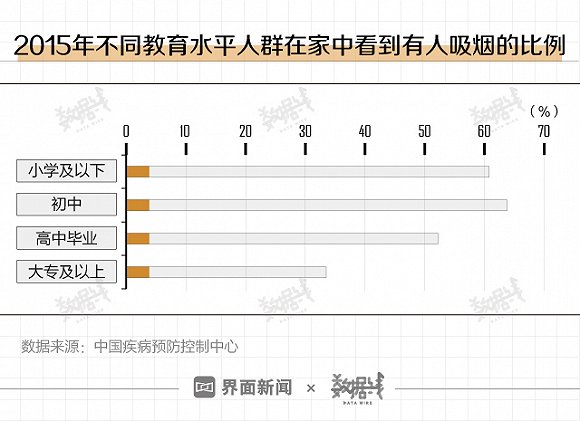 教育水平较低的人群,在家看到有人吸烟的比例较高。中国疾病预防控制中心数据显示,2015年,在教育水平仅初中毕业或更低的人群中,看到有人吸烟的比例均超60%。