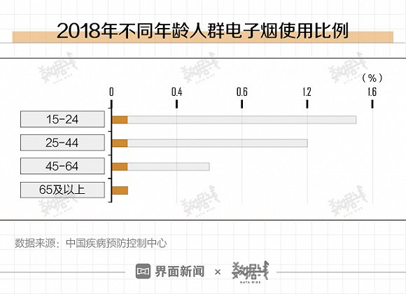 从年龄来看,年轻人已成为使用电子烟的主要人群。根据2018年中国成人烟草调查,15-24岁年龄组人群电子烟使用率为1.5%。