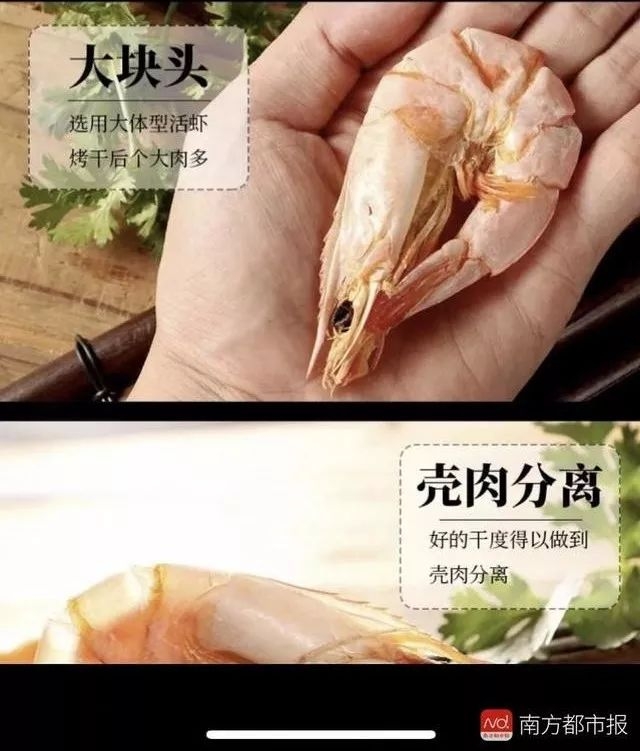 除此之外,董小姐收到的虾干只有约3厘米长,与广告中展示的“半个手掌大”的虾有明显差别。“味道也是一言难尽。这么说吧,收到的虾和视频中的、产品页面介绍的,完全是三样不同的东西。”她对南都记者说。