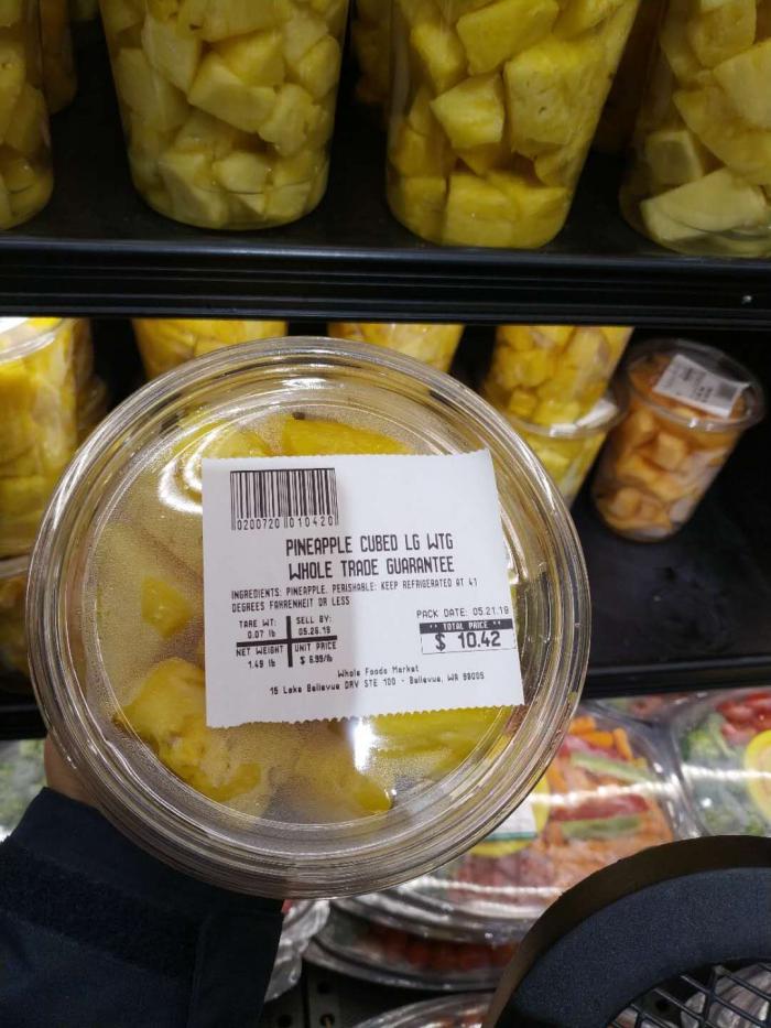 美国劳动力价格较高,鲜切水果价格昂贵,一盒菠萝10.42美元,约合人民币72元(摄:王佳昕)