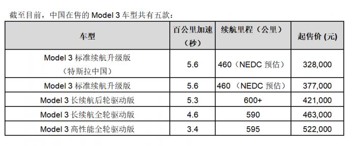 Model 3标准续航升级版(特斯拉中国)续航里程为460公里(NEDC预估),起售价为人民币32.8万元,预计交付时间为6至10个月。与目前在华在售的37.7万的该车型进口版本相比,便宜近5万。