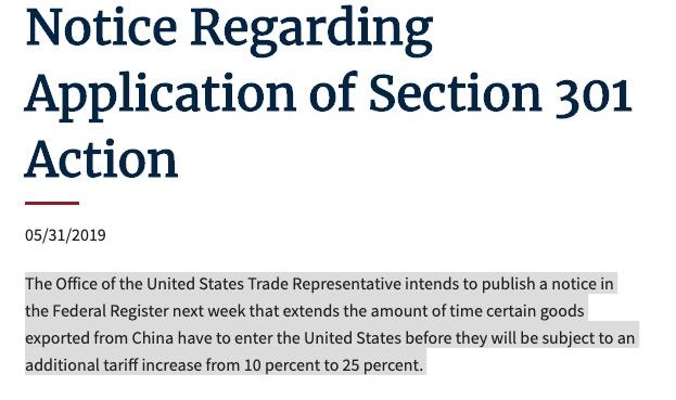 据美国贸易代表办公室(USTR)消息,USTR将会在下周联邦公报上发布一份通知,延长自中国出口的某些商品进入美国的时间至6月15日,随后,这些商品的关税才会从10%提高到25%。