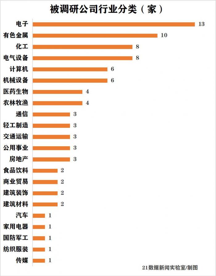 从行业分布来看,过去一周电子、有色金属行业最受机构青睐,相关调研公司分别有13家和10家。电气设备、化工行业均有8家公司获调研。