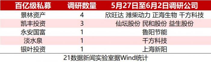 从具体调研机构来看,百亿知名私募中,景林资产、凯丰投资、永安国富、淡水泉、银叶投资共调研了9只个股。其中,景林资产和淡水泉共同调研了千方科技。而景林资产和凯丰投资调研动作最频繁,除了千方科技,景林资产还调研了欣旺达(300207.SZ)、潍柴动力(000338.SZ)、正海生物( 300653.SZ)。凯丰投资调研了仙坛股份(002746.SZ)、民和股份(002234.SZ)、益生股份( 002458.SZ)。