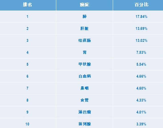 肺癌、大肠癌、甲状腺癌、乳腺癌、肝癌、胃癌、宫颈癌、白血病、淋巴癌、食管癌