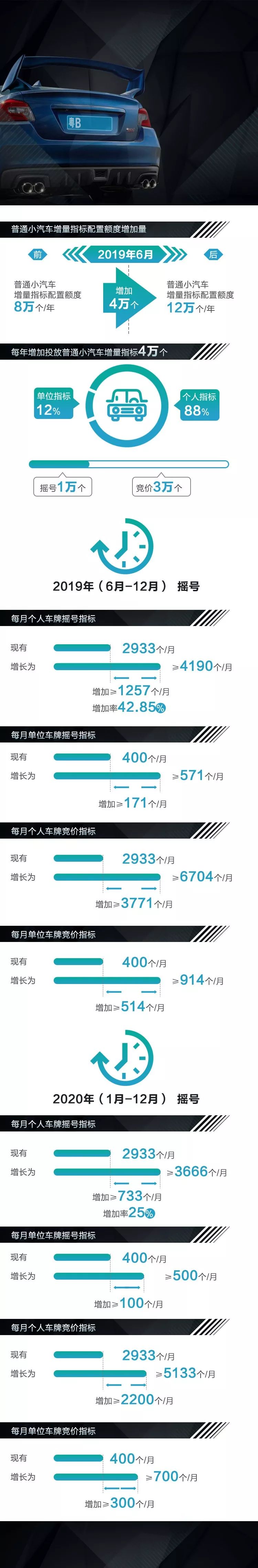 本月起,在每年原定8万个车牌指标配额基础上,2019 年至2020年每年增加投放普通小汽车增量指标4万个。