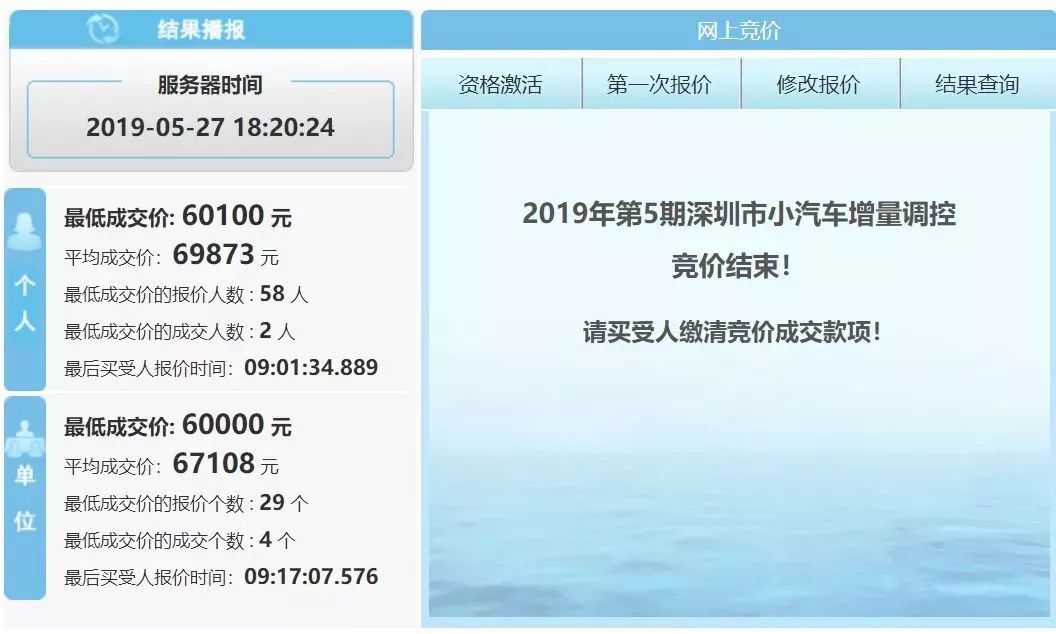 5月27日,第5期深圳市小汽车增量指标竞价结果出炉,本期个人车牌平均成交价为69873元,单位车牌成交均价为67108元。