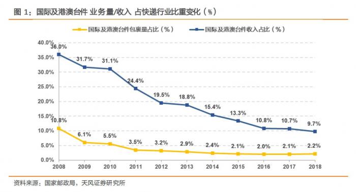 天风证券表示,上市公司中均已开发出标准化的国际快递服务,“上市公司中2018年顺丰的国际件收入达到26.29亿,国际件市场市占率为4.5%,而国际快递业务占顺丰整体收入比重则为2.9%;通达系快递亦有国际件业务,如同样拥有航空网络的圆通,2018年国际件收入2.13亿,申通、韵达等均已提供标准化的国际件进出口服务。客观地看,当前上市快递公司在网络健全度等方面与海外巨头、EMS等确实存在差距,且主要服务于电商类需求,但长期看存在巨大的发展空间。”