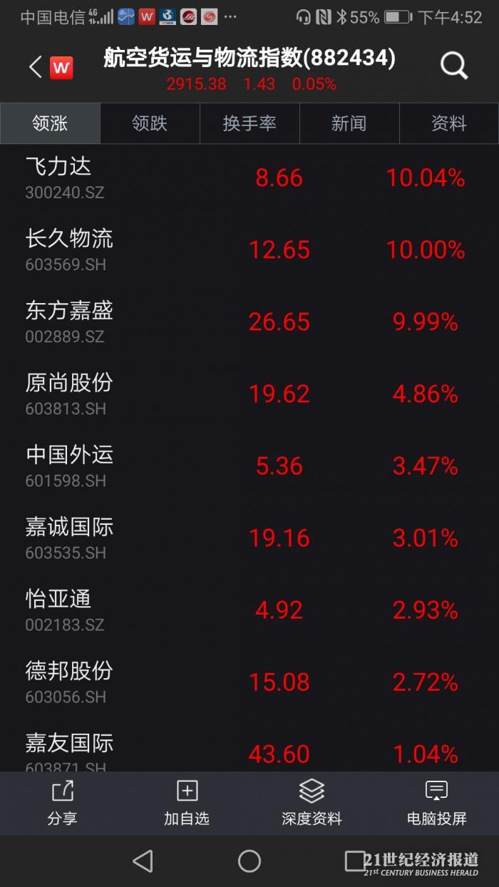 截至收盘,Wind航空货运与物流指数收涨0.05%,板块个股走势则出现一定分化,飞力达、长久物流、东方嘉盛仍为一字涨停,板块15只个股上涨,一只平盘,15只下跌。