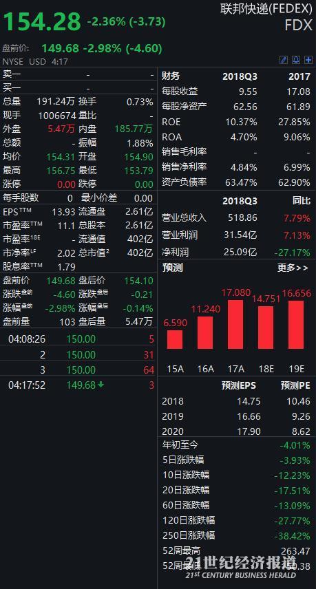 截至6月3日记者发稿,联邦快递盘前下跌2.98%。