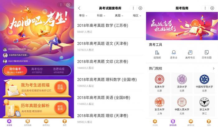 备考阶段,为考生提供了历年真题及解析,今年新增了“我为考生送祝福”活动;高考期间,联合全国各地上百位一线教师,现场校对并上传答案,在小程序中提供估分服务;高考成绩公布后,高考智能小程序还为考生提供智能志愿填报服务。