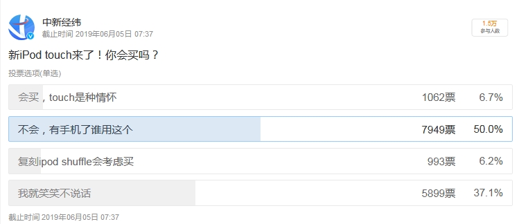 用户评价不高,消费欲望自然暗淡。据中新经纬官方微博发起的一项有1.6万人参与的调查“新iPod touch来了!你会买吗?”结果显示,50%的人选择了“不会,有手机了谁还用这个”,仅有6.7%的人选择了“会买,touch是种情怀”,还有37.1%的人选择了“我就笑笑不说话”。