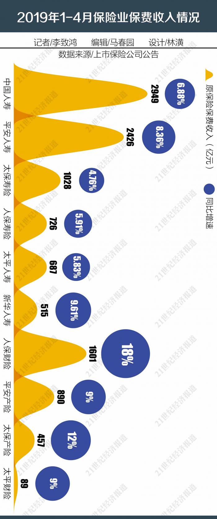这一时段正是保险业“开门红”的关键时期。1-4月,中国人寿原保险保费收入2949亿元、平安人寿原保险保费收入2426亿元、太保寿险原保险保费收入1028亿元、人保寿险原保险保费收入726亿元、太平人寿原保险保费收入687亿元、新华人寿原保险保费收入515亿元,同比增速分别为6.88%、8.36%、4.76%、5.91%、5.83%、9.61%。