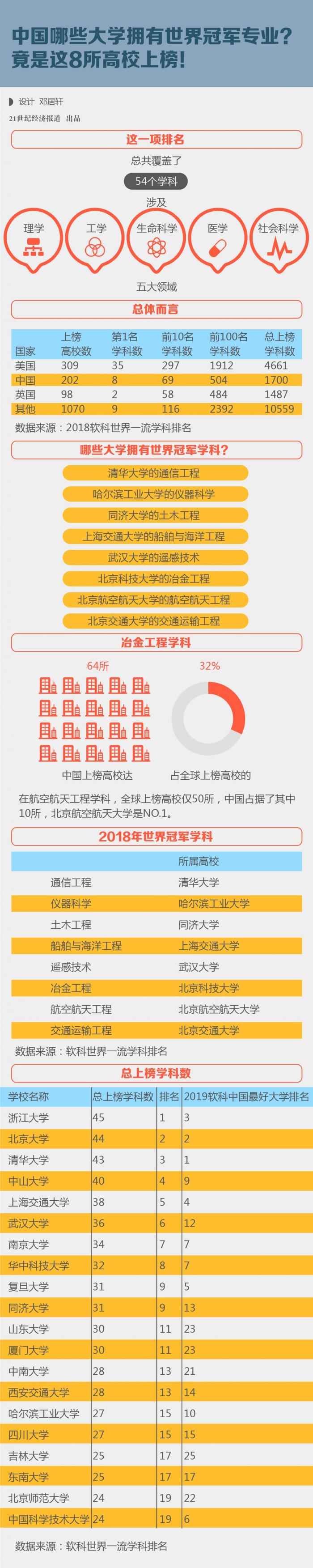 总体而言,中国共有202所高校上榜,上榜总次数1700次,仅次于美国,位列全球第二。其中,在54个冠军学科中,中国高校有8个上榜。