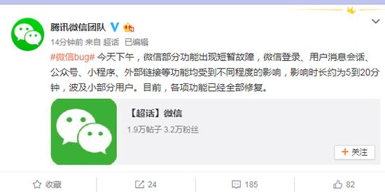 稍晚时候,微信方面公告称,今日下午微信部分功能出现短暂故障,微信登录、用户消息会话、公众号、小程序、外部链接等功能均受到不同程度的影响,影响时长约为5到20分钟,波及小部分用户。