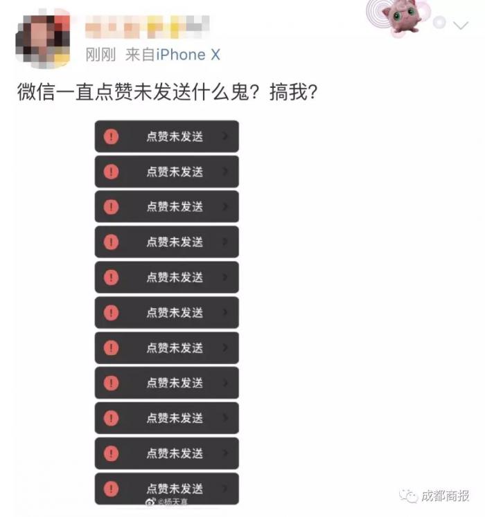 此前,据网友反馈,此次微信故障涉及消息无法发送或发送延迟,红包无法发送,PC端微信无法登陆,无法换头像,无法查看微信运动步数,无法点赞,无法查看账单等多种常用功能。