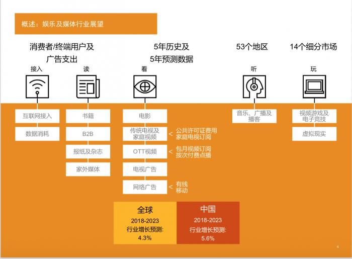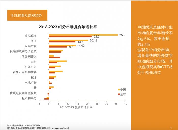 普华永道预测,中国娱乐及媒体行业收入在未来五年将以5.6%的复合年增长率发展,至2023年达到4347亿美元。