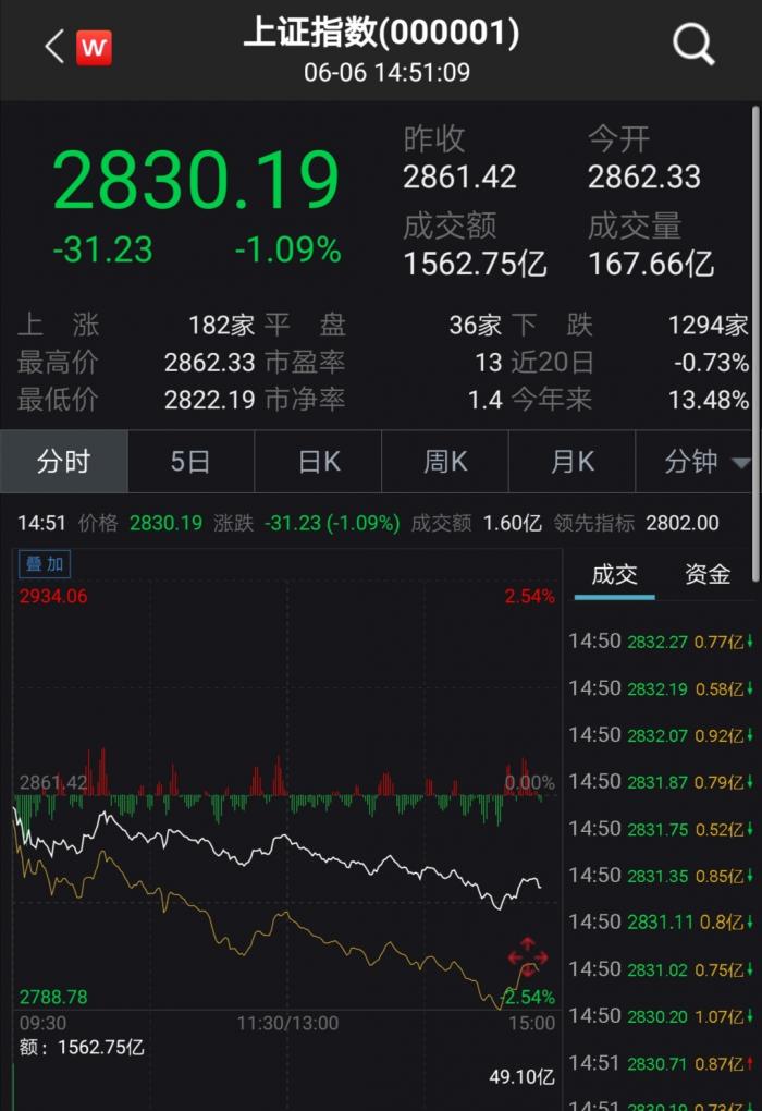 6月6日,截至发稿,上证综指下跌1.07%,创业板指跌逾2%,两市仅400余股飘红。