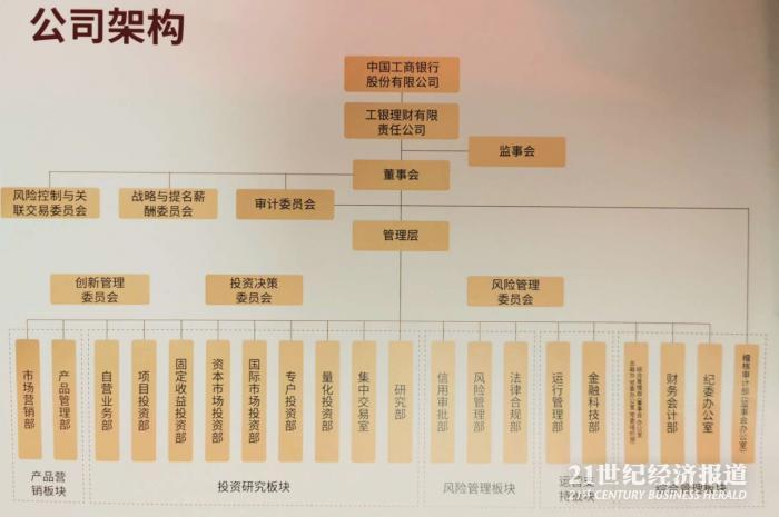 从公司架构来看,工银理财是中国工商银行的全资子公司,下设董事会、监事会审计委员会等,原工商银行资产管理部总经理顾建纲任董事长,许海任监事长;从管理层来看,下设产品营销、投资研究、风险管理、运营支、综合管理五大板块,总共包含20个部门,原金融市场部兼同业业务部负责人唐凌云出任总裁。
