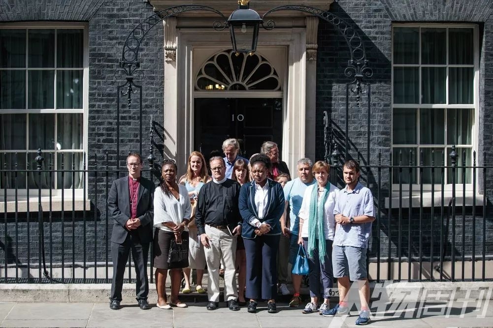 2017年6月17日,伦敦火灾受害者、遇难者亲属、志愿者及当地社区负责人在唐宁街10号合影